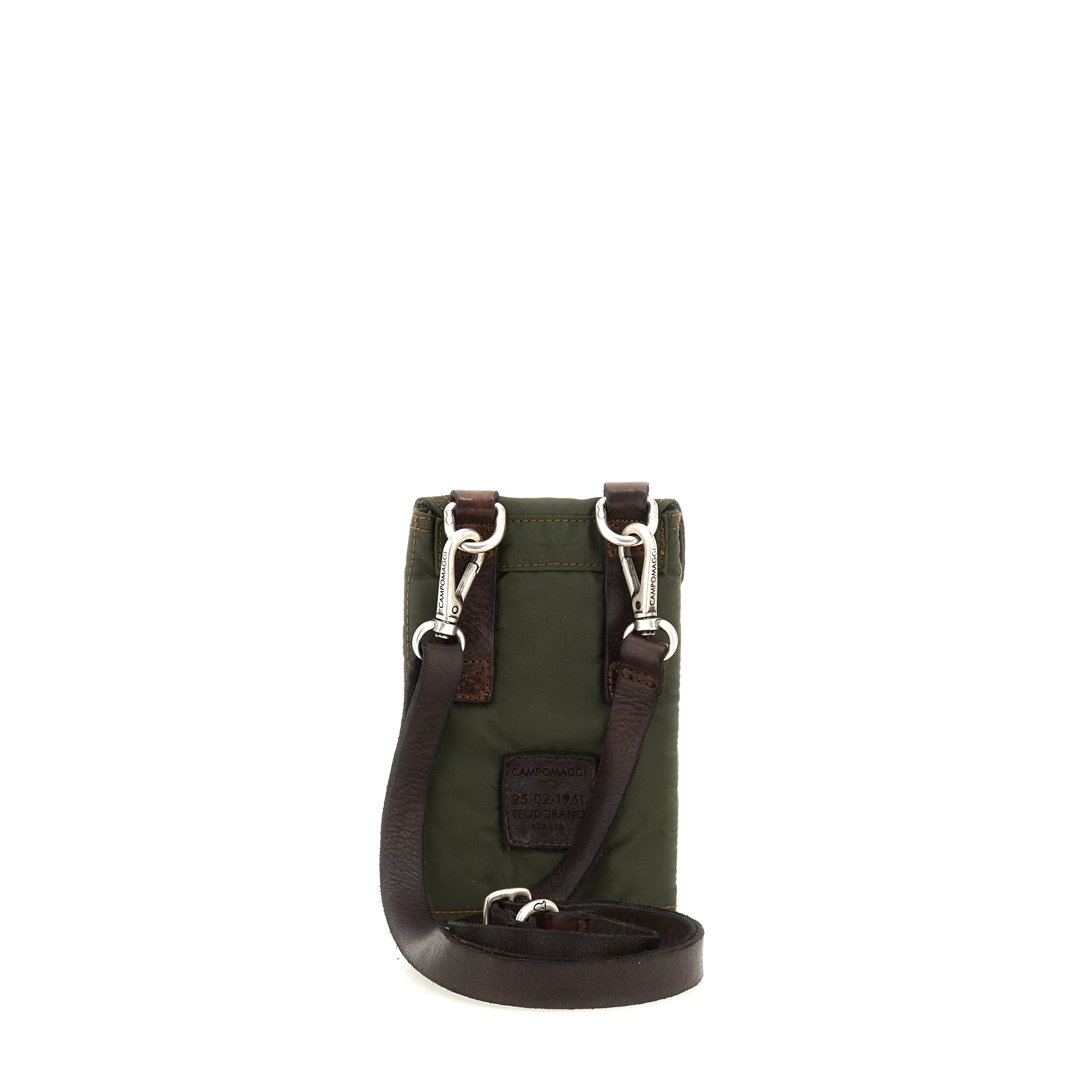 נרתיק טלפון , בעיצוב גברי , עשוי שילוב ניילון ועור בקר בצבע חום צבאי למראה עמיד וייחודי. כולל תא פנימי עם רוכסן לאחסון בטוח של הטלפון וחפצים קטנים.