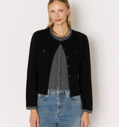 קרדיגן אלגנטי בסריג רך , בעיצוב דו-שכבתי המשלב שכבת בסיס בצבע אפור מתחת לשכבת קרדיגן קצרה יותר עם כפתורים וכיסי דמה בחזית.