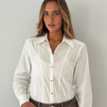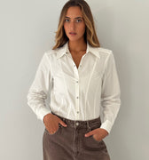 חולצה לבנה בגזרת סלים פיט קלאסית ומדויקת, המעוצבת מבד כותנה איכותי לנוחות מרבית ומראה מלוטש. החולצה כוללת סגירת כפתורים קדמית, צווארון מחוייט ושרוולים ארוכים עם מנח’טים קלאסיים