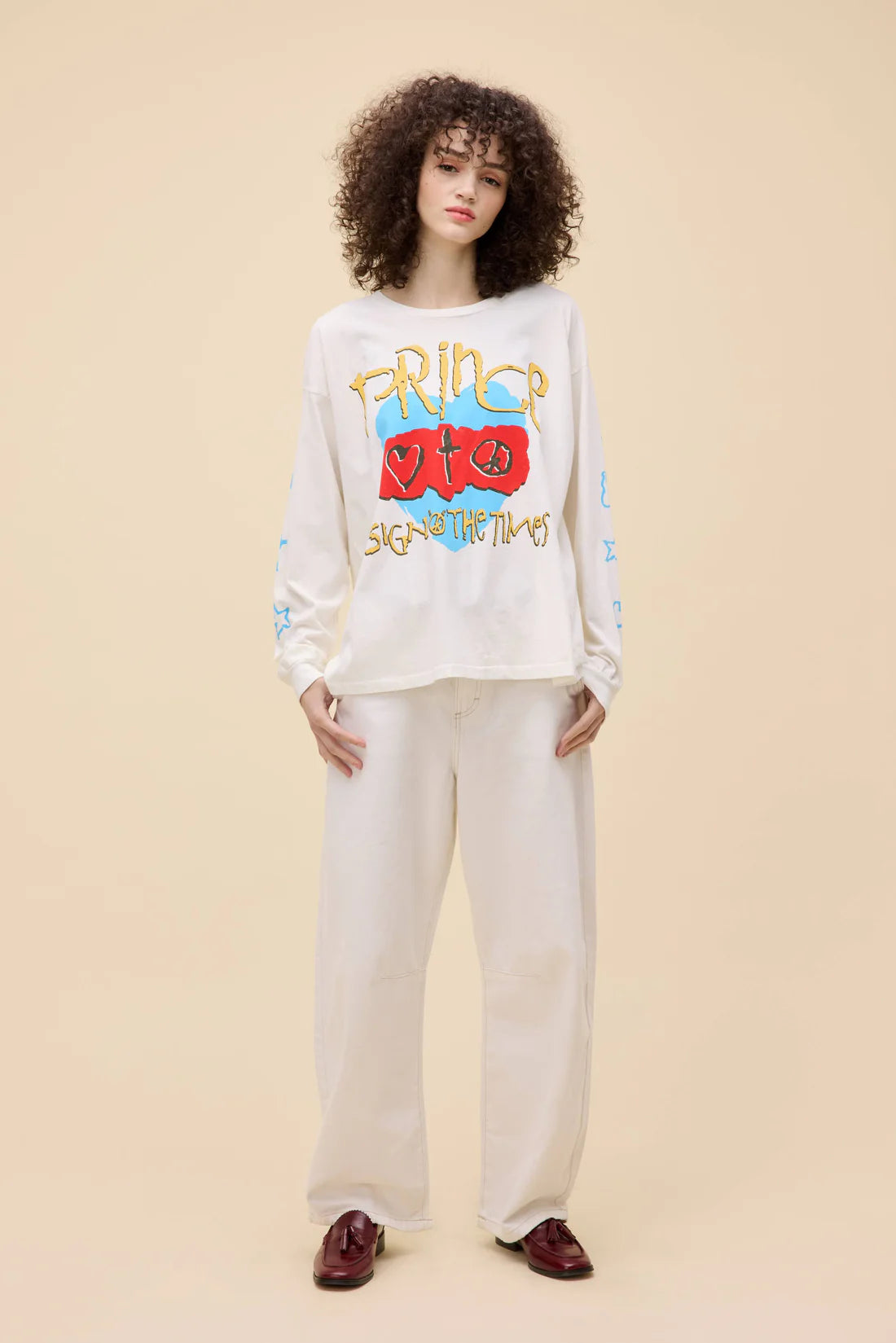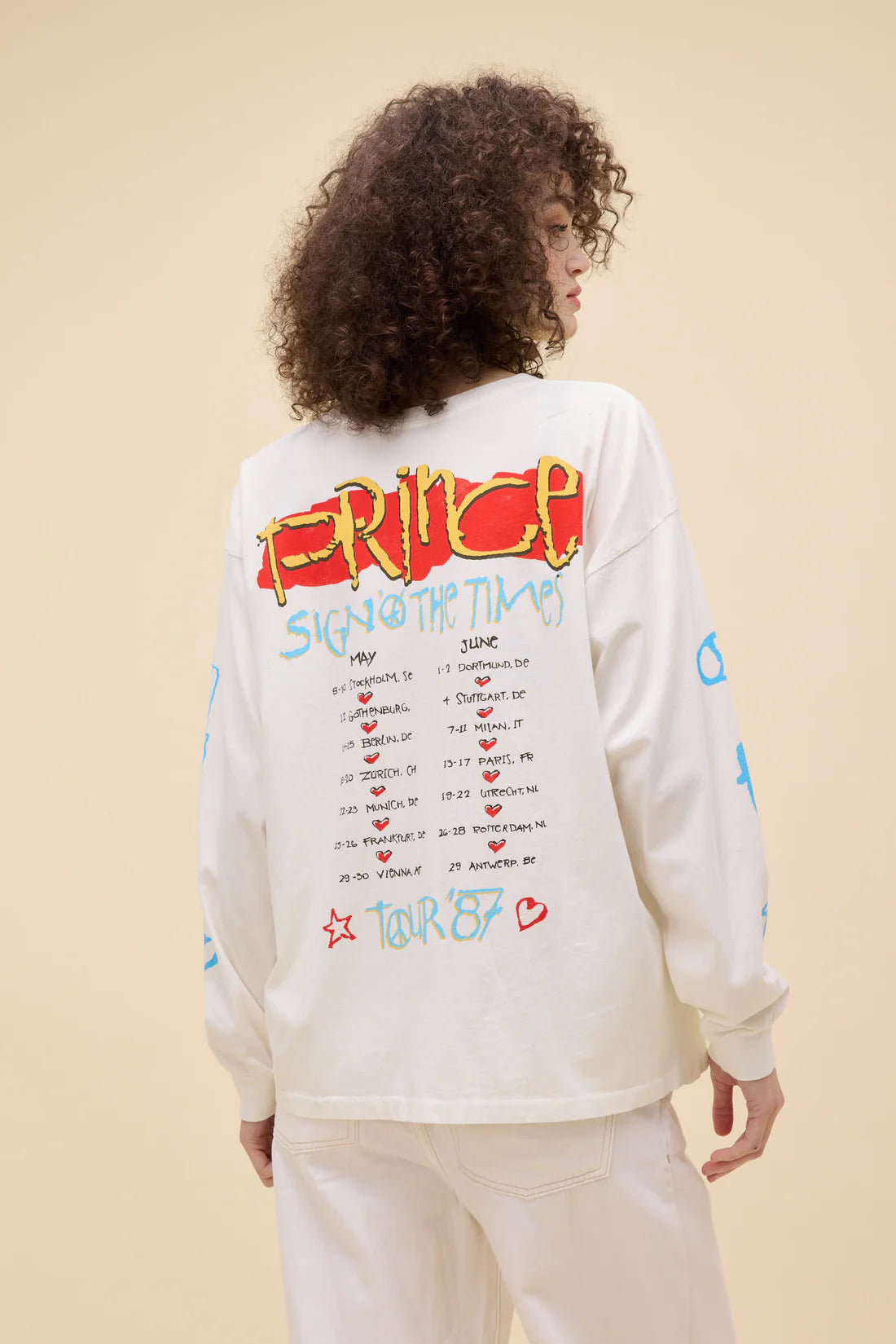 חולצת שרוול ארוך Prince Sign of the Times מצדיעה לאגדה ולסולן ה-R&B עם הדפס דו-צדדי הכולל את תחנות סיבוב ההופעות וסמלים המזוהים עם השם האייקוני הפריט בגזרה נינוחה, עשוי בד רך ונעים למגע ומביא אווירה קלאסית ואספנית של שנות ה־80