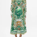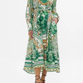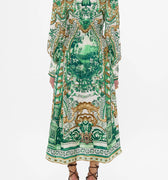 שמלת חולצה בעיצוב אוסטרלי עם קשירת מותן, בהשראת ארמון קווילוז שבפורטוגל. הדפסים ייחודיים בגוונים רגועים של ירוק וזהב, שמתחברים לאריחים ולארכיטקטורה המלכותית – לוק אלגנטי ונינוח שמתאים לכל רגע מיוחד.