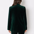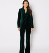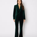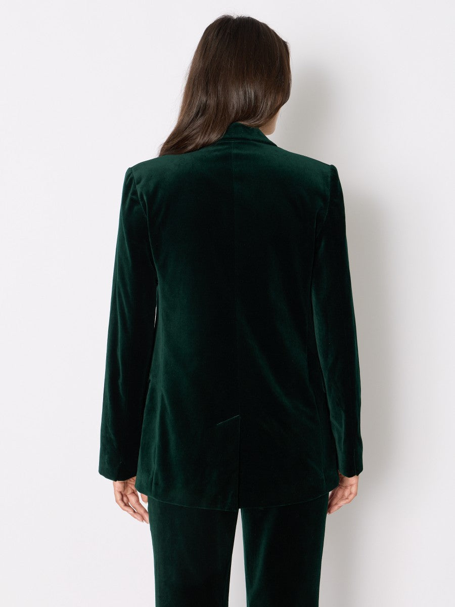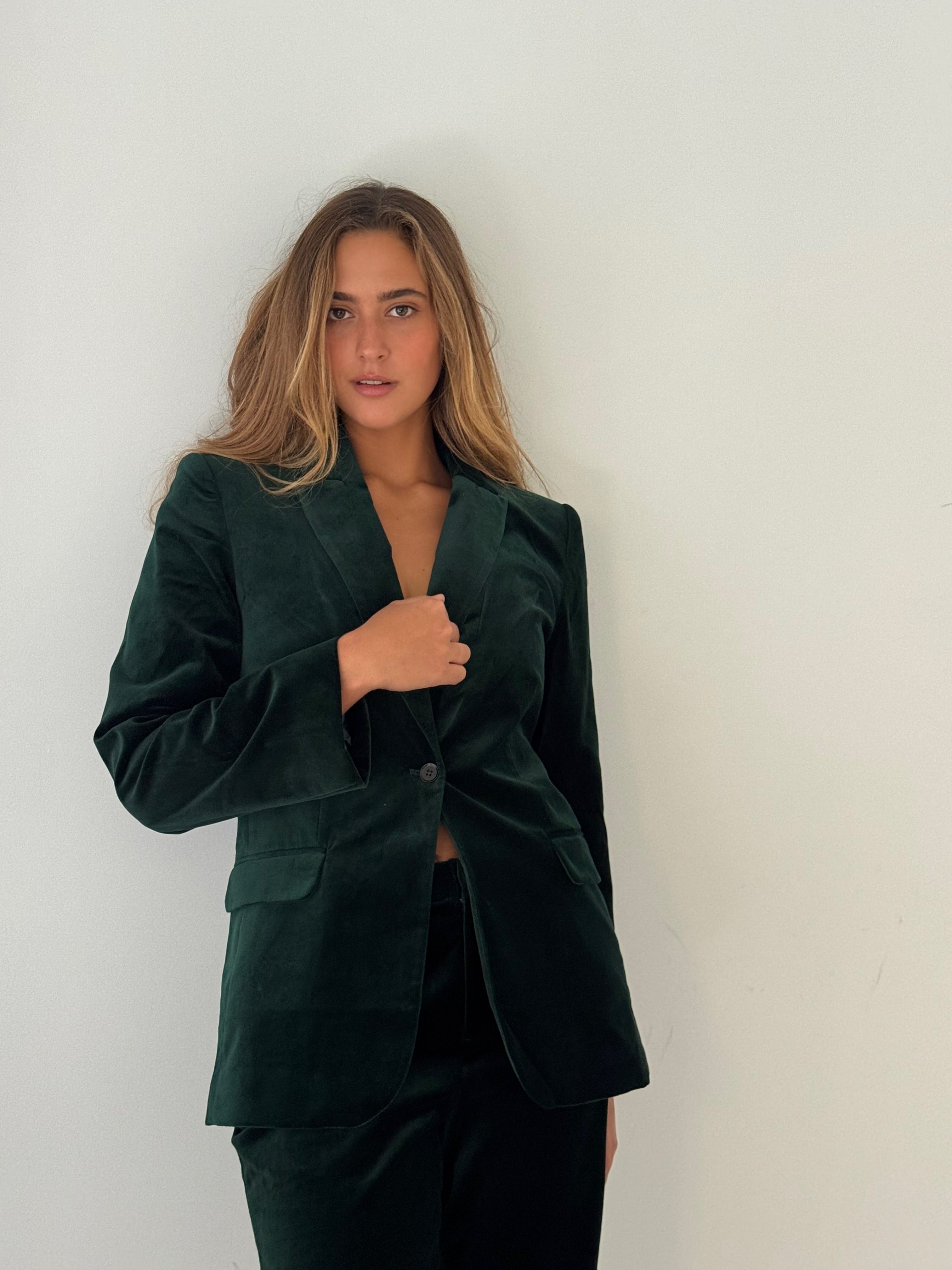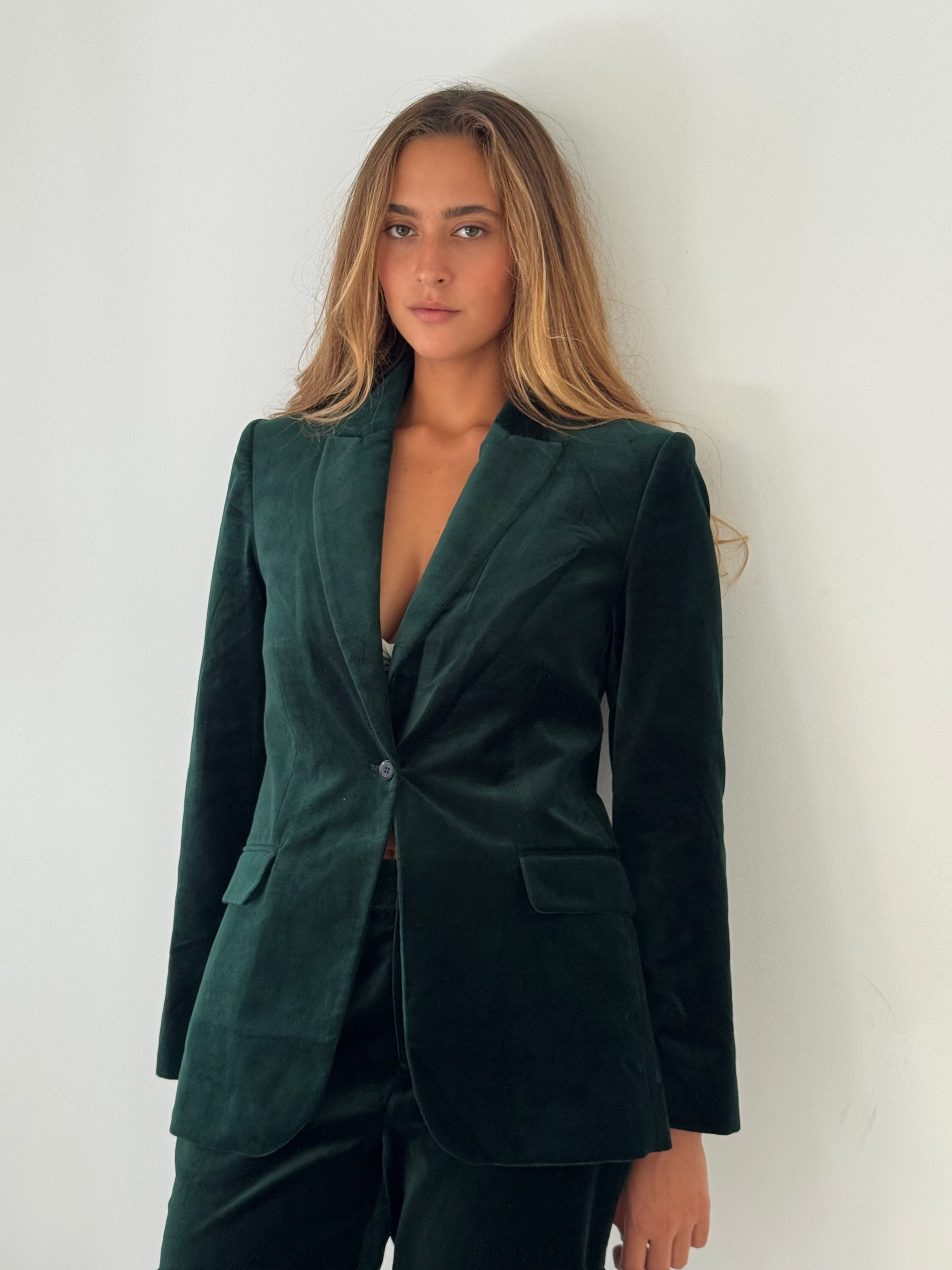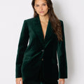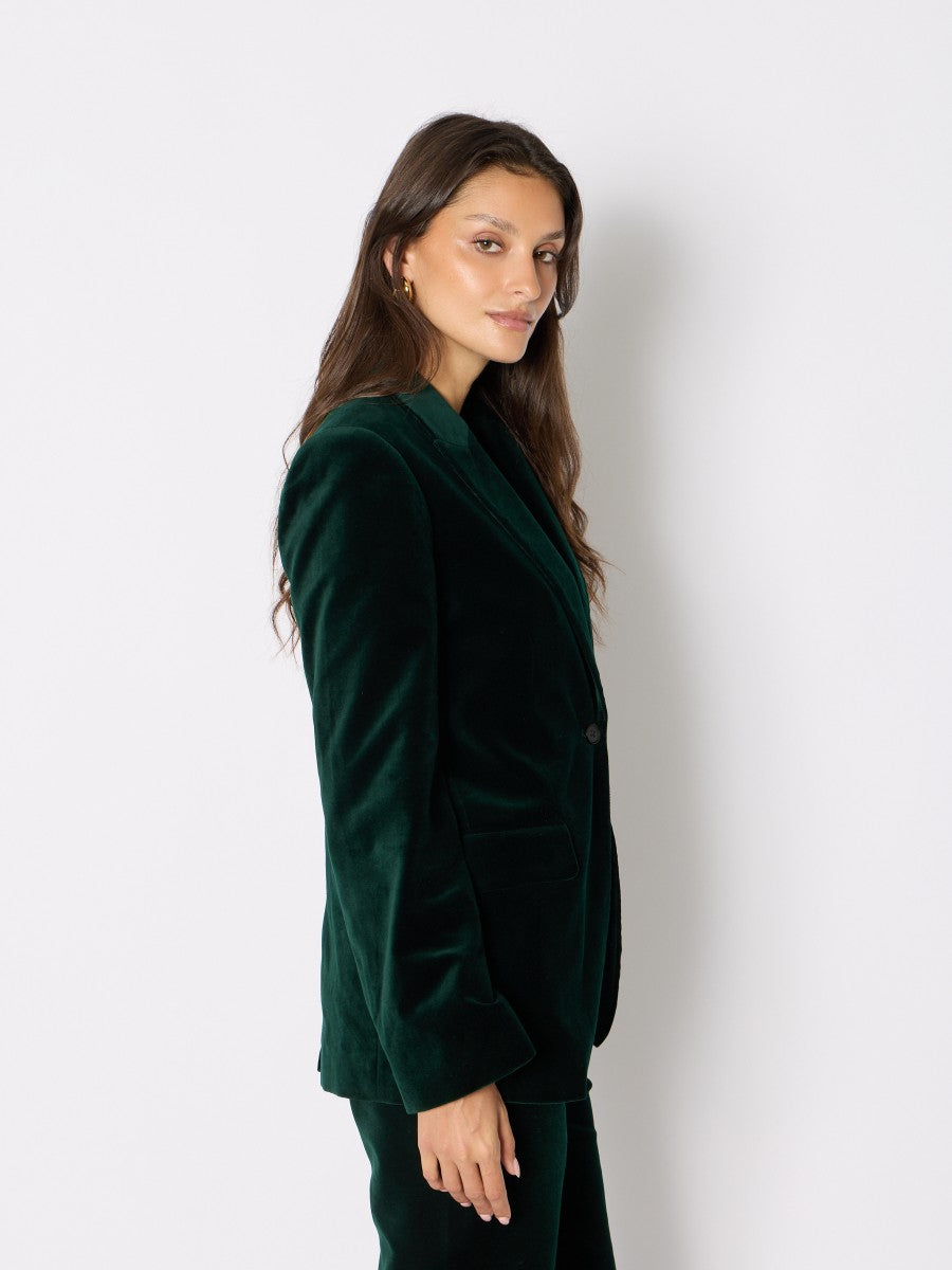 בלייזר אלגנטי בגזרה מחויטת, עשוי מקטיפה רכה ונעימה בגוון ירוק אמרלד עמוק. בעל סגירה עם כפתור אחד, צווארון מחודד קלאסי ושני כיסי צד עם דשים.