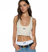 גופיית טנק קרופ בצבע שמנת עם מחשוף עגול וגב רייסר. עשויה ג’רזי פונטל קליל ונעים עם חצי בטנה בחזית, משלבת טיקט ארוג של SOTT ורקמת T-box. פריט בסיס ממותג שמשתלב מושלם עם כל ג’ינס של Ksubi.