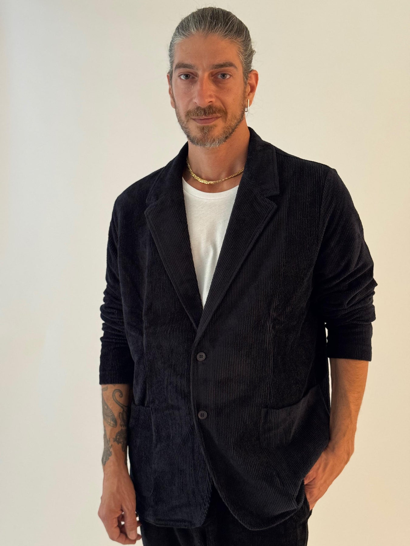 בלייזר לגברים עם כפתור אחד, עשוי מקרדיג’וי בשילוב 83% כותנה ו-17% פוליאסטר, עם מראה חלק ואלגנטי המתאים ליום-יום ולעבודה