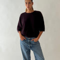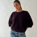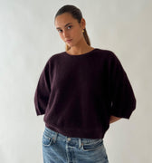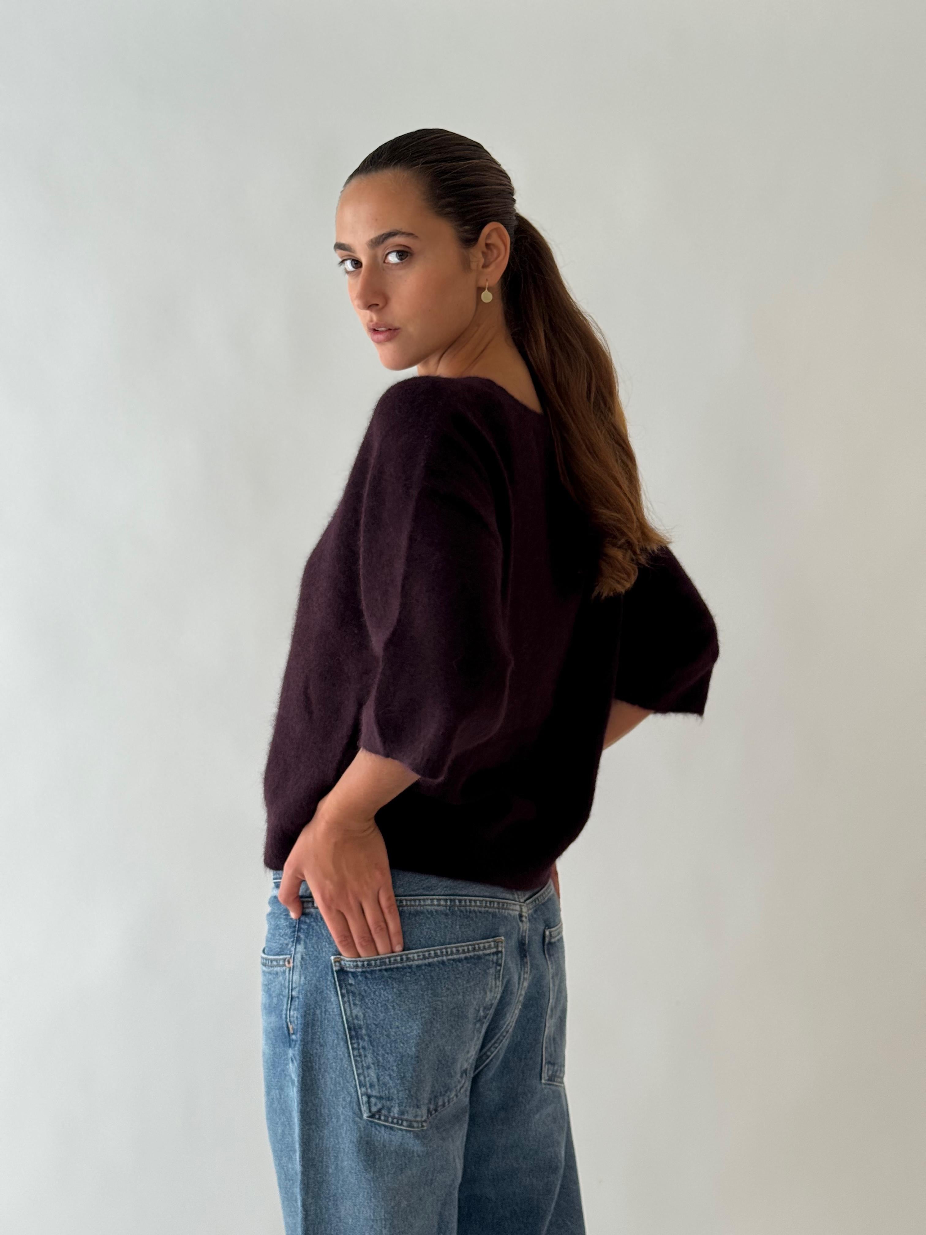 סוודר בצבע חציל, עשוי מתערובת 80% צמר ראקון ו-20% פוליאמיד. רך וחמים, עם מראה יוקרתי ונעים למגע