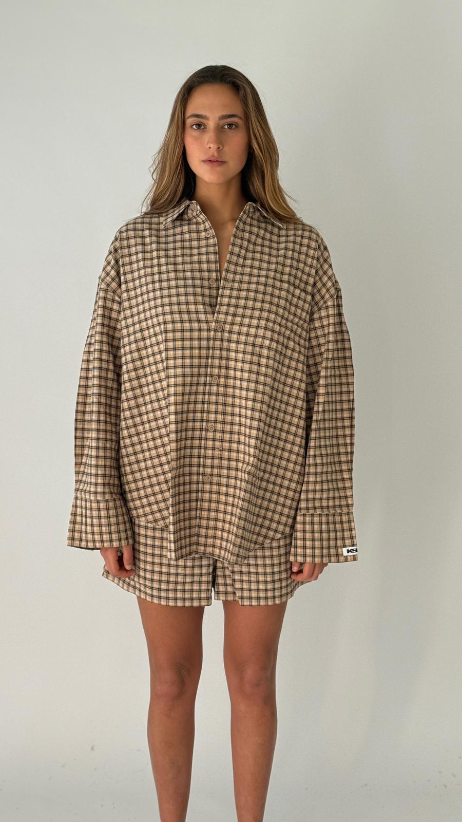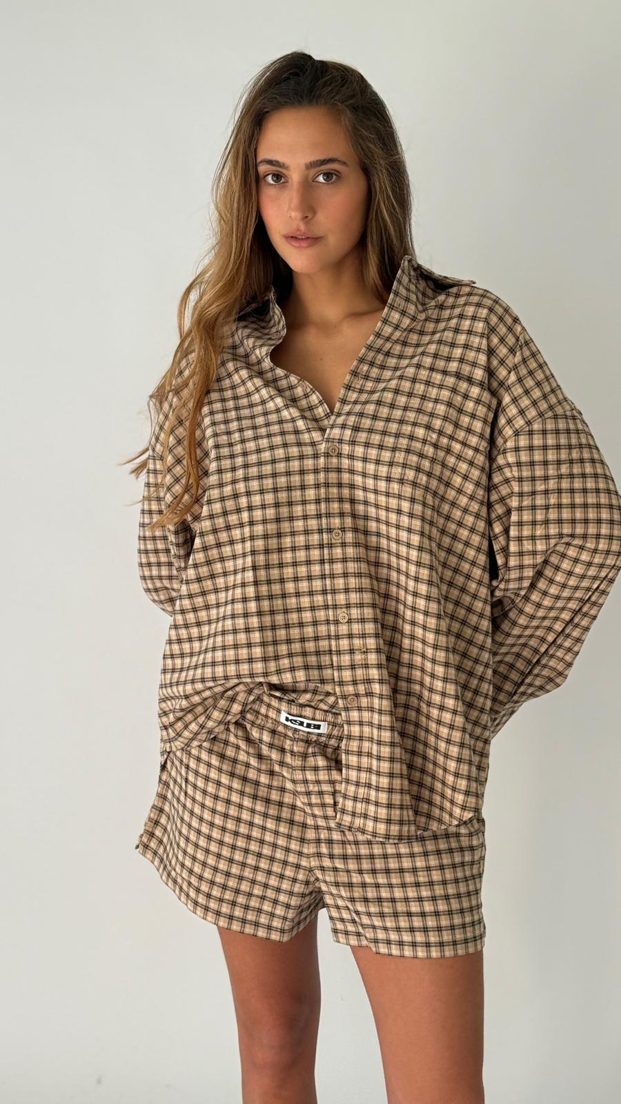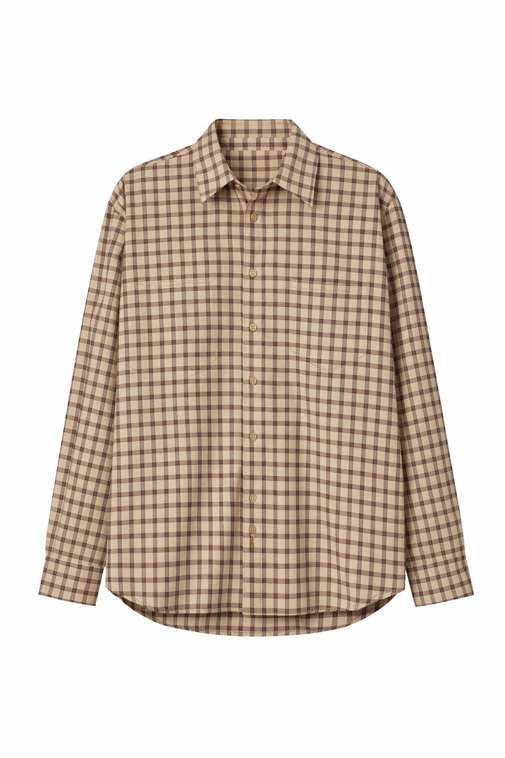 חולצת כפתורים שרוול ארוך בצבע חום, בגזרה רגילה, עשויה כותנה רכה לנוחות יומיומית