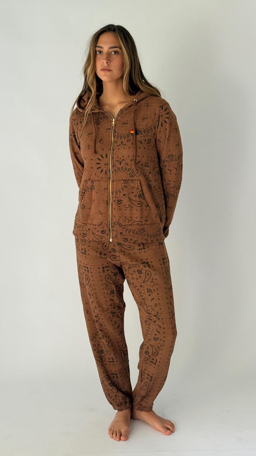 מכנסי טרנינג עם הדפס בנדנה ותיפורים ייחודיים, נוחים ליום-יום. עשויים מבד משולב: 50% פוליאסטר, 38% כותנה, 12% רייון.