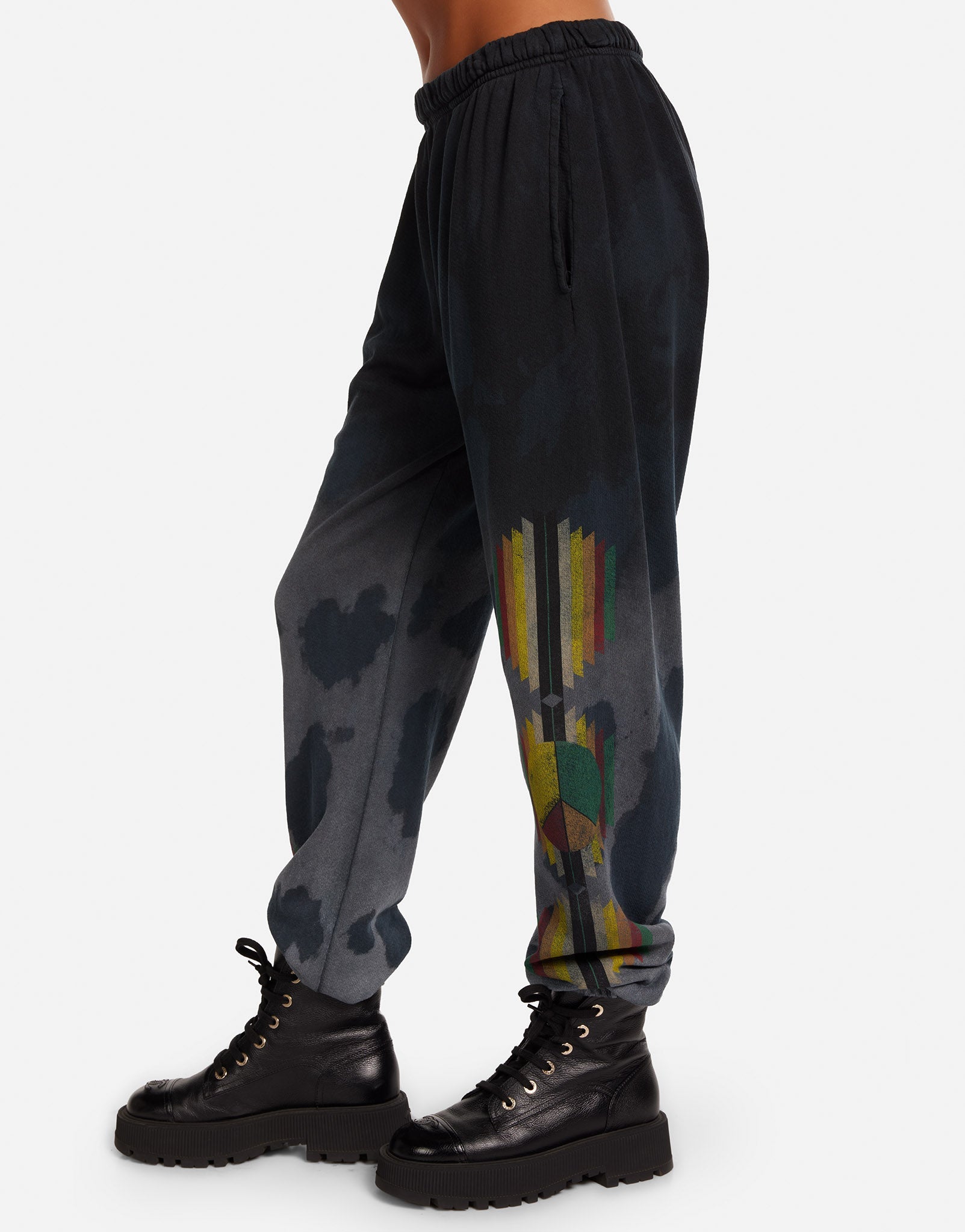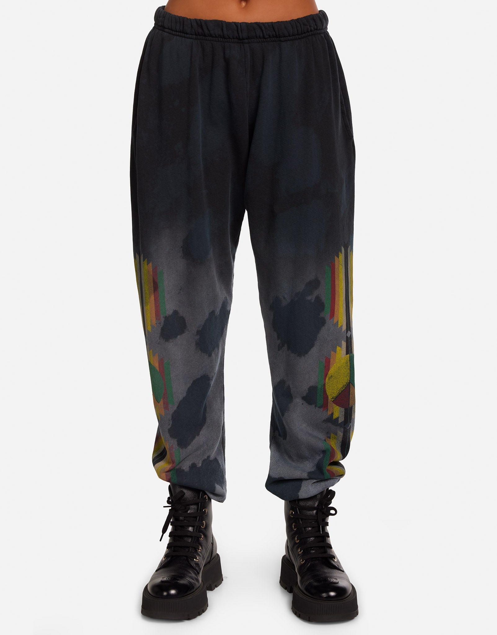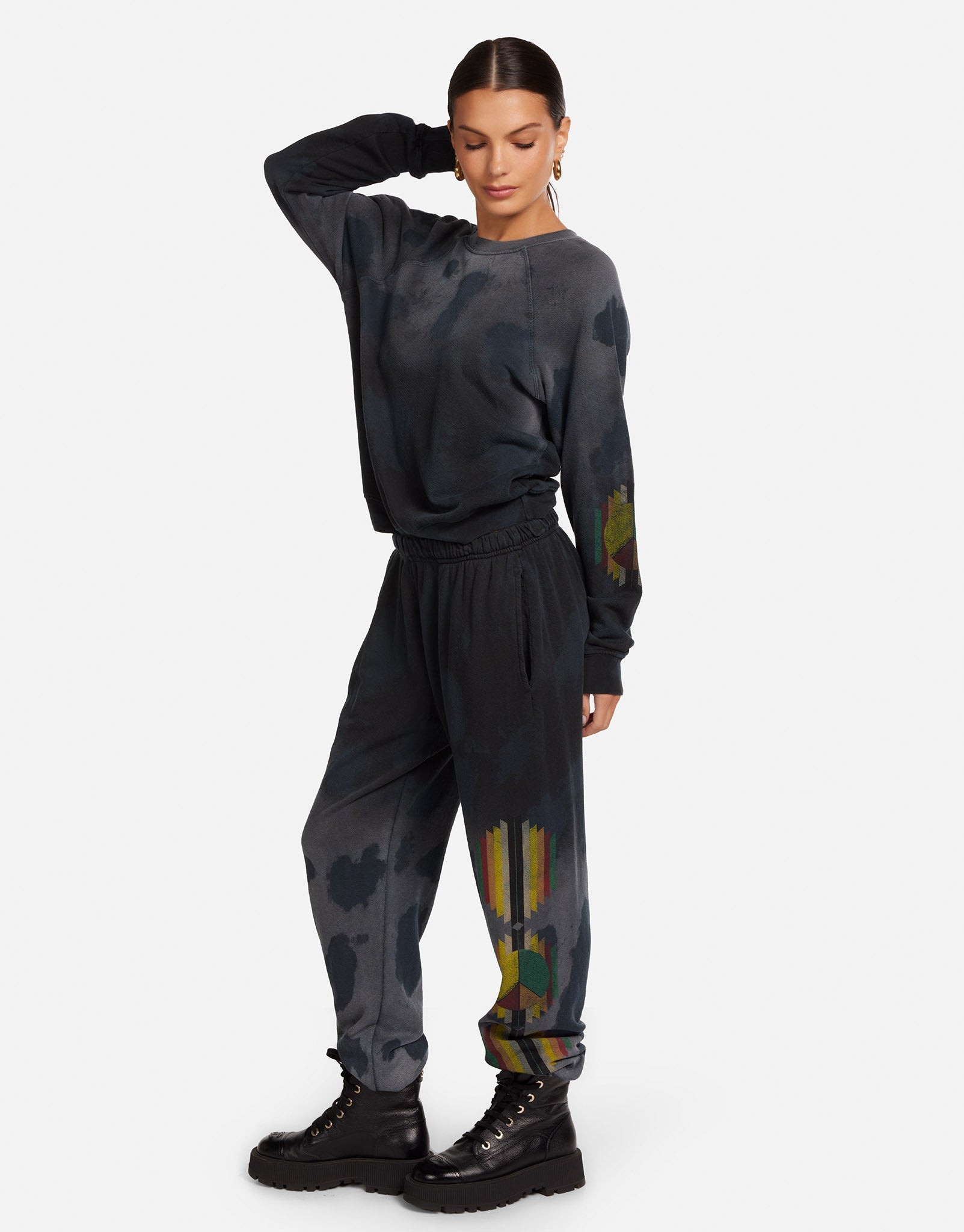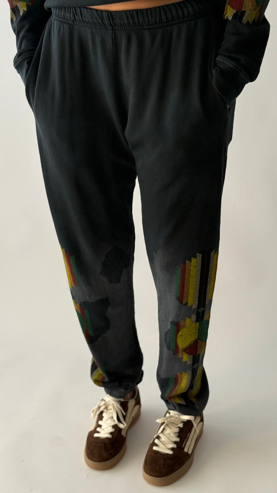 מכנס בגזרה נינוחה בגוון שחור עם אפקט התזות והדפס שלום בסגנון שבטי. מראה רוקנרולי עם נוכחות בולטת, מבד נוח שמתאים ללוק יומיומי עם אמירה.