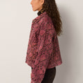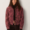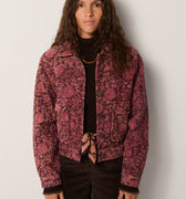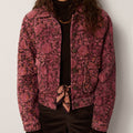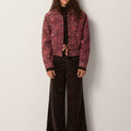 ג’קט בגזרת קרופ עשוי מקטיפה דקה במרקם קווילט עדין, עם הדפס פרחים בגווני קורל ויין במראה טקסטורלי עשיר המזכיר שטיח ארוג. הג’קט בעל מפתח עגול ללא צווארון וכתפיים מרופדות בעדינות, כיסים קדמיים ותיפורים טונאליים שמוסיפים תחושת עבודת יד וחום טבעי.