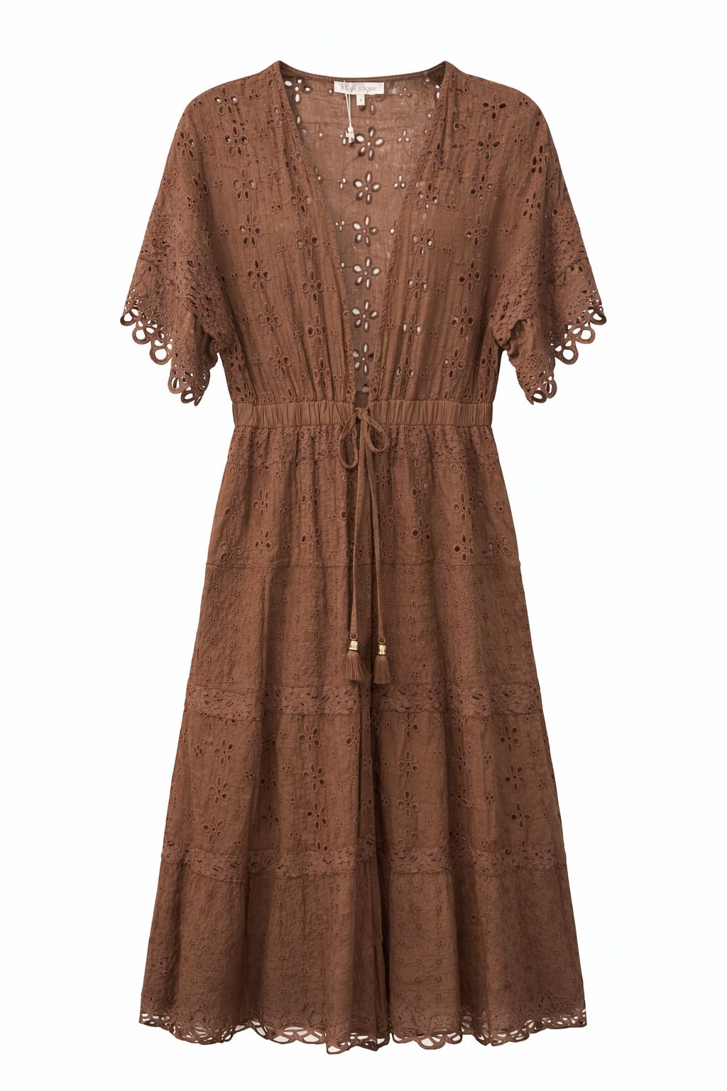 שמלת מקסי כותנה 100% בסריגת איילט עדינה בכל השמלה, עם פתיחה קדמית וקשר במרכז, ומותן אלסטי המותאם בצורה מושלמת. שמלה קלילה ואוורירית, אידיאלית לחופשות חוף וטיולי שקיעה.