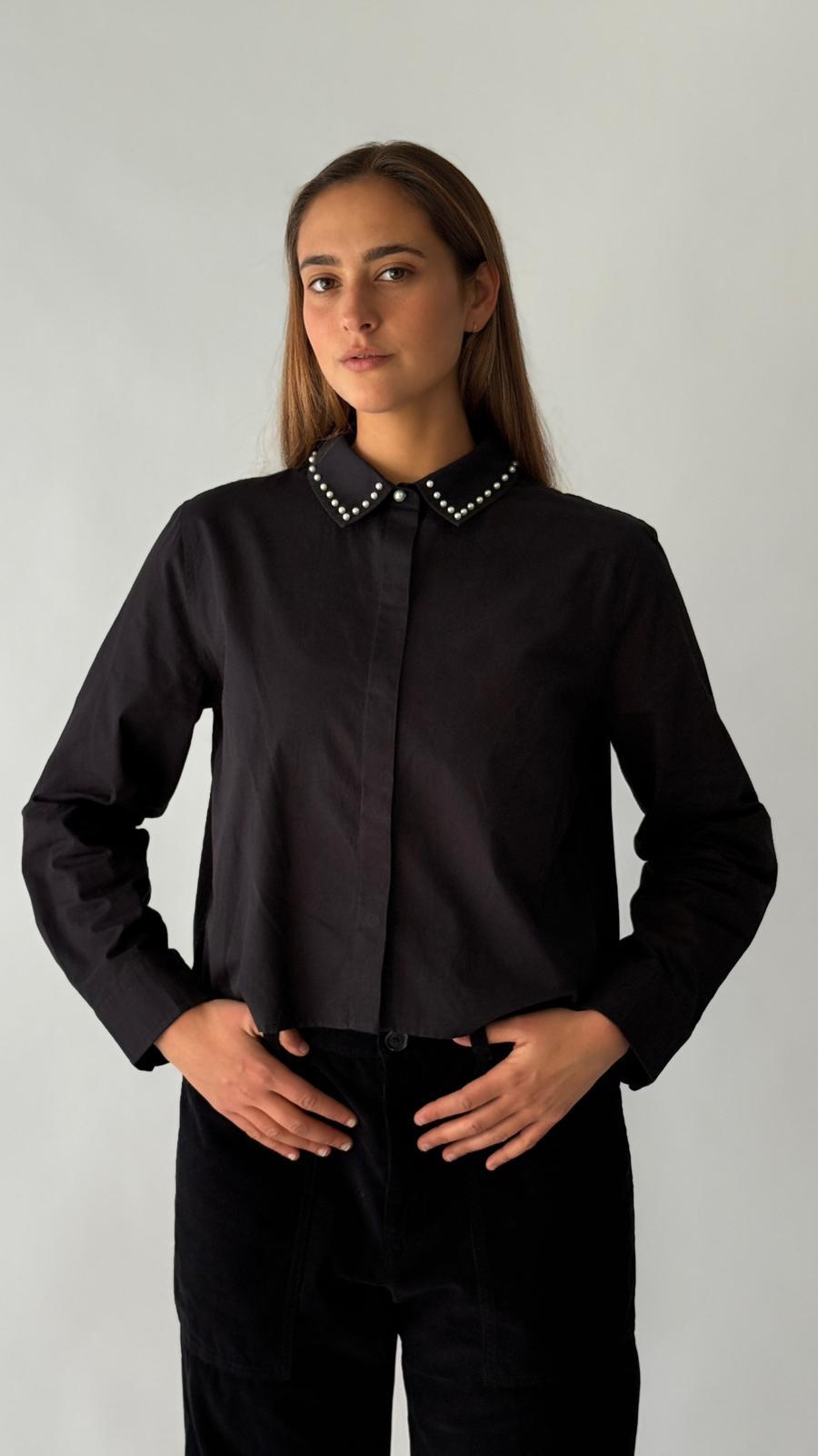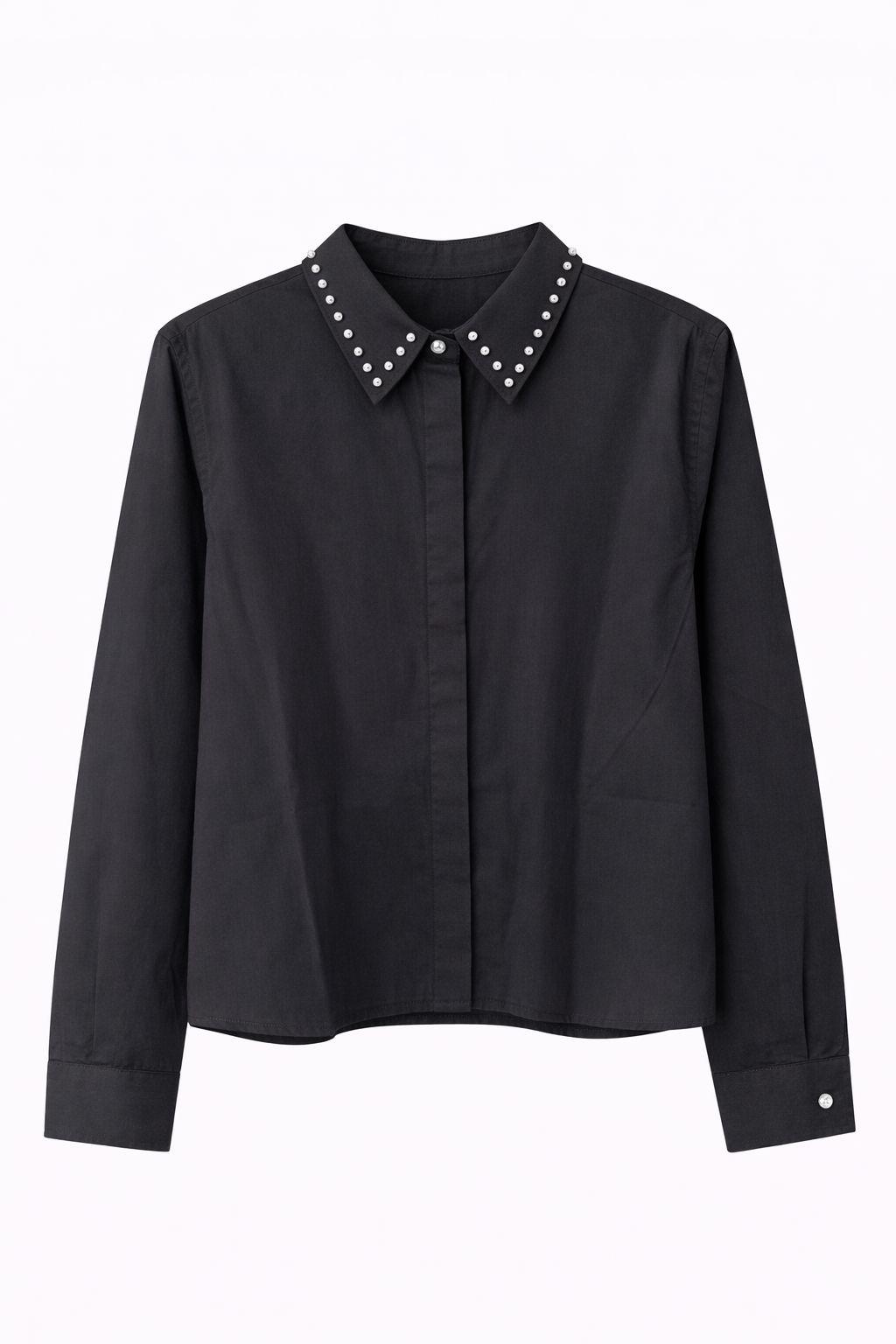 חולצה מכופתרת עם שרוולים ארוכים, בגזרה נקייה ומעודכנת. פרטי ניטים עדינים בצווארון מוסיפים טאץ’ מחוספס ומלא אופי, ומשתלבים עם בד רך ונעים ללבישה יומיומית או לערב קליל