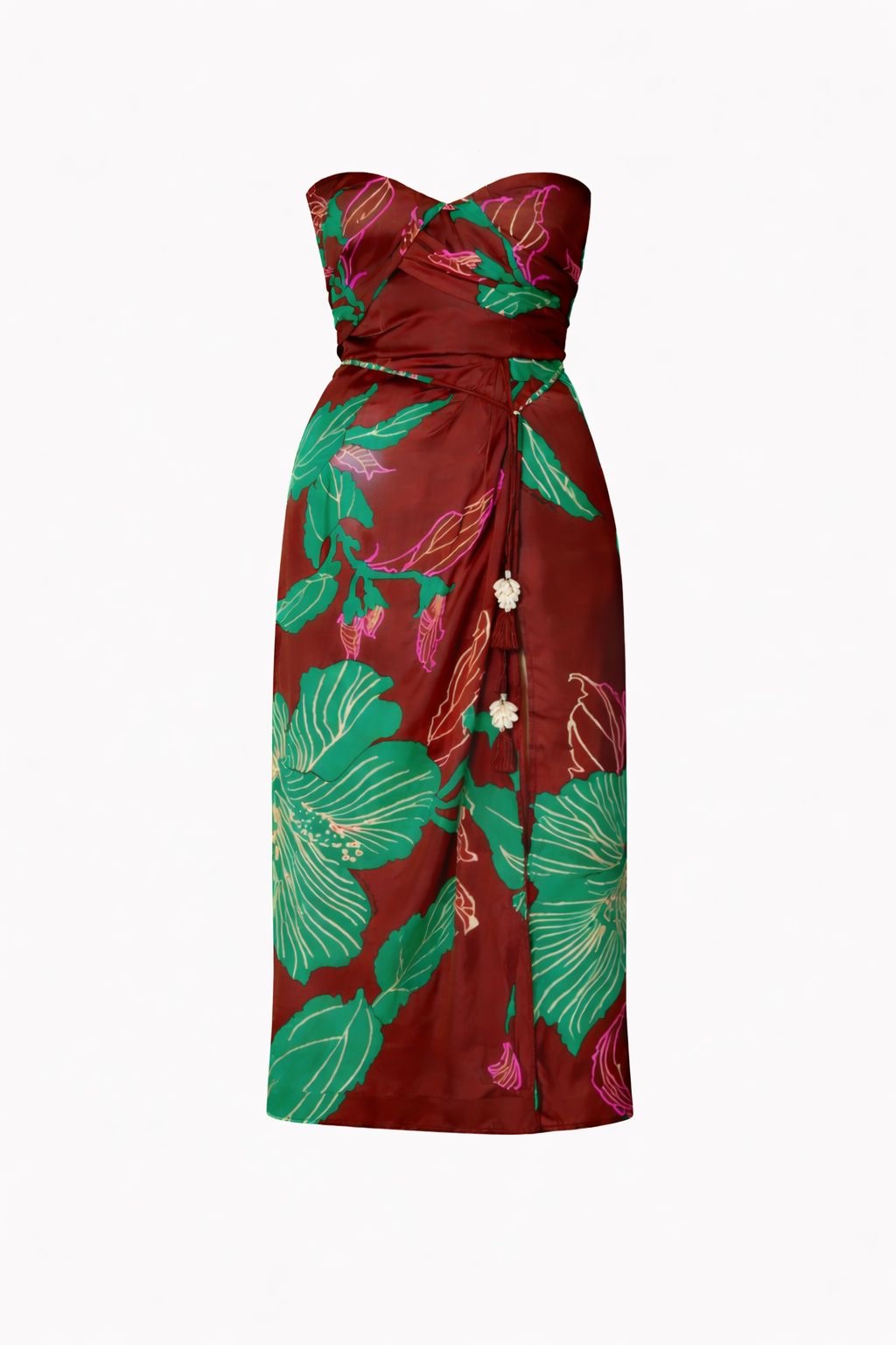 שמלת מקסי מסאטן ויסקוזה במראה זורם ואלגנטי. עיצוב סטרפלס עם קשירה נשלפת לצוואר, מחוך א־סימטרי עם קפלים ותמיכה פנימית לשמירה על מבנה מושלם. חצאית בסגנון פאראו עם קשירת גדילים מעוטרת צדפים במותן, גב מכווץ ורוכסן נסתר לגימור נקי. אורך עד הקרסול לתנועה נשית וחופשית.