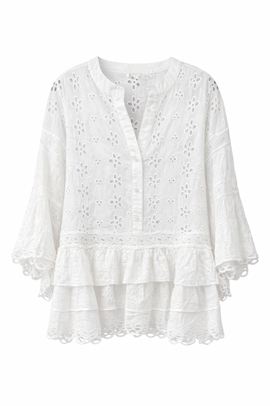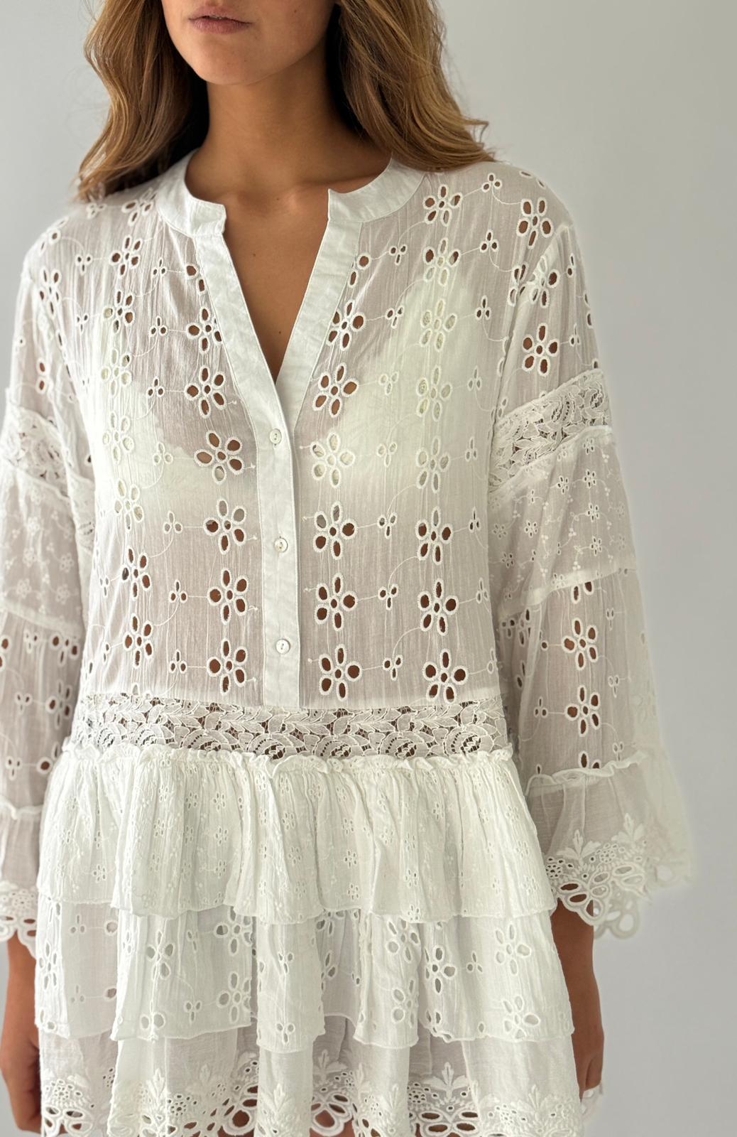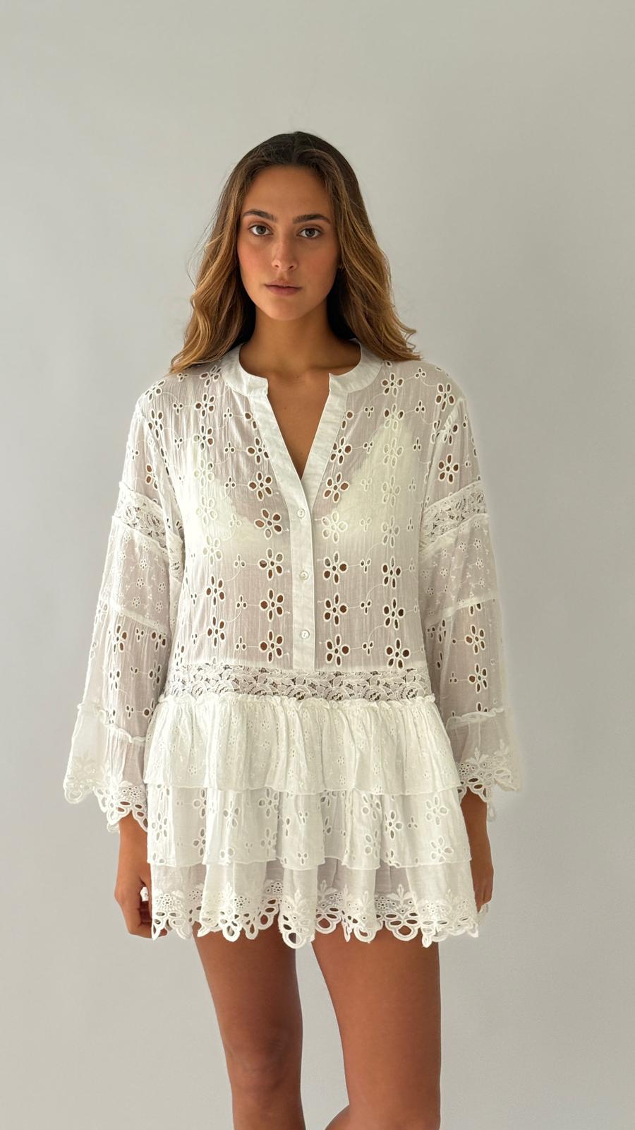 שמלת מיני כותנה 100% בסריגת איילט עדינה בכל השמלה, עם כפתורים קדמיים. שרוולים בולטים וחצאית בשכבות יוצרים מראה אלגנטי וקליל, מושלם לבריכה או לאירועים קיציים.
