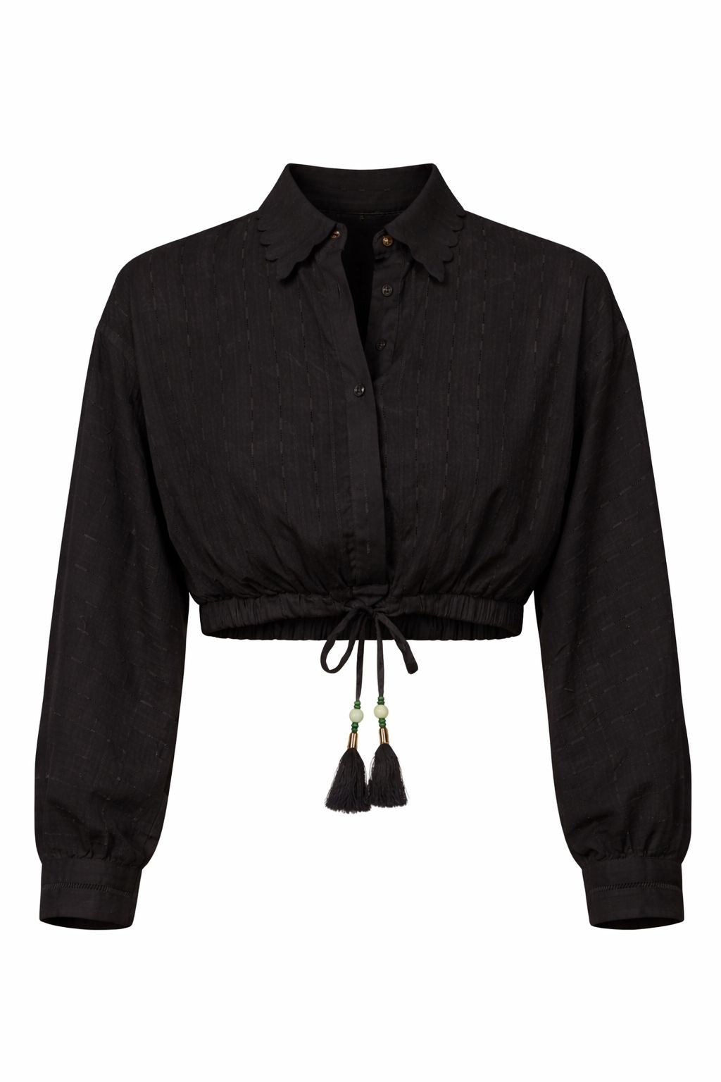 חולצת כותנה עם פסים מחוררים למראה קליל ורומנטי. צווארון גלי עם כפתור מצופה, גדילים מעוטרים פנינים וסגירת כפתורים נסתרת עם כפתורי צדף. שרוולי עטלף רחבים, מנג’טים עם תחרה ומותן אלסטית יוצרים גזרה נשית ומעודנת.