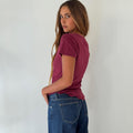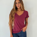 טי שירט עם מחשוף V שתלבשי שוב ושוב. עשויה מכותנה סלאב יוקרתית לרכות יוצאת דופן, תחזוקה קלה וגזרה מחמיאה. עם שרוולים קצרים וצווארון עם גימור, זו תוספת מושלמת לארון שלך.