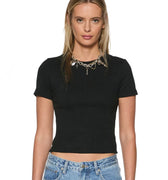 טישרט שחורה בגזרת שורט עם קרופ מחמיא ושרוולים קצרים. עשויה כותנה אירופאית איכותית עם טקסטורת ריב נעימה למגע. רקמת סימן דולר וחתימת המותג Ksubi משלימים את הלוק.