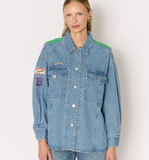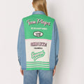 ג׳קט ג׳ינס ייחודי בגזרת אוברסייז, משולב עם פאצ’ים ספורטיביים בחזית וגב סרוג בצבעי ירוק-לבן-ורוד עם הדפסים גרפיים נועזים. בעל כיסי חזית עם סגירת כפתורים, צווארון קלאסי וסיומות תפרים בולטות להשלמת המראה הקז’ואלי.